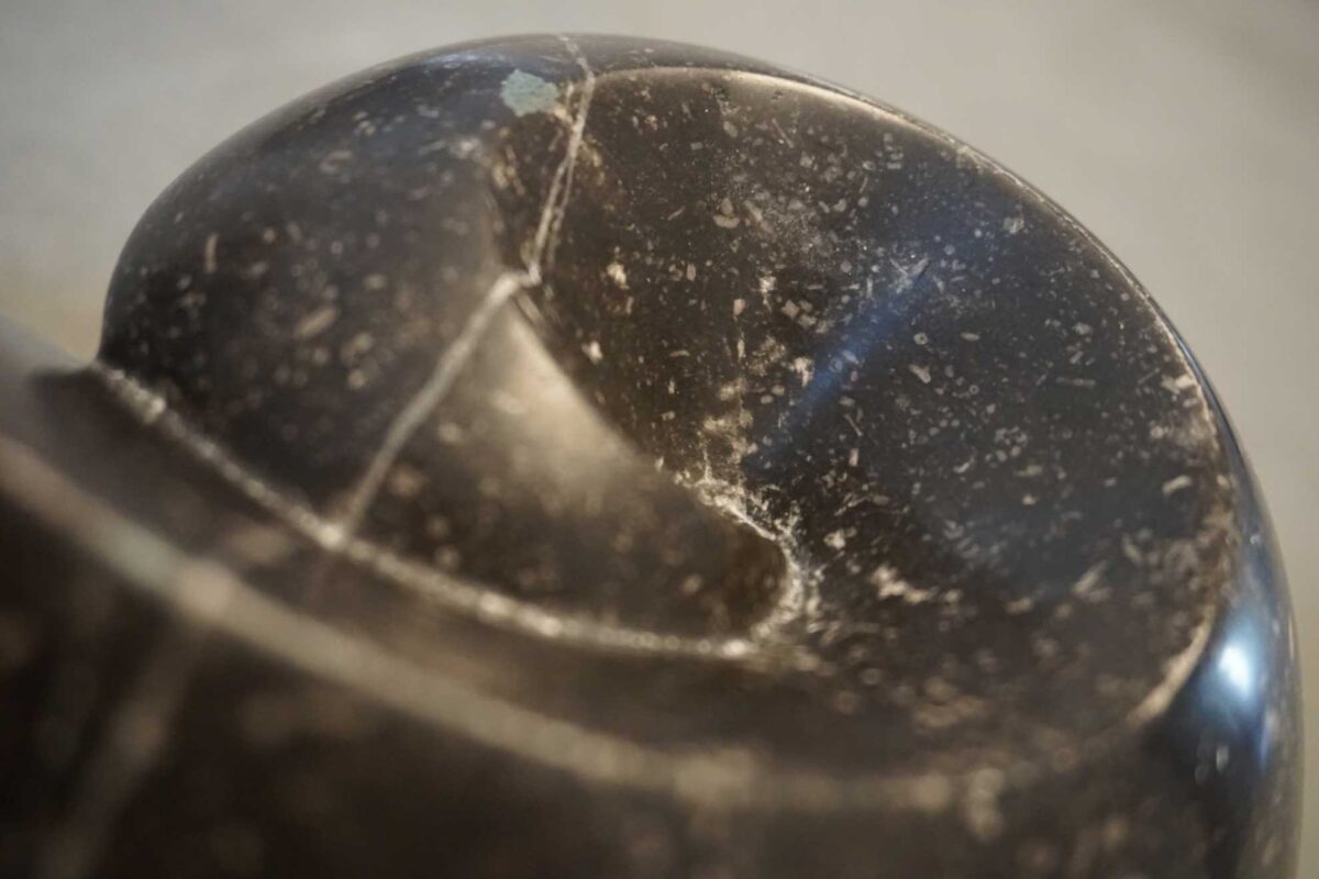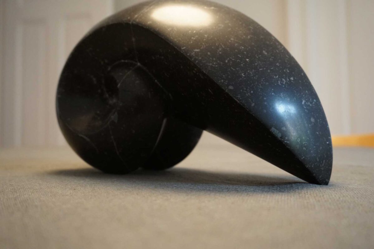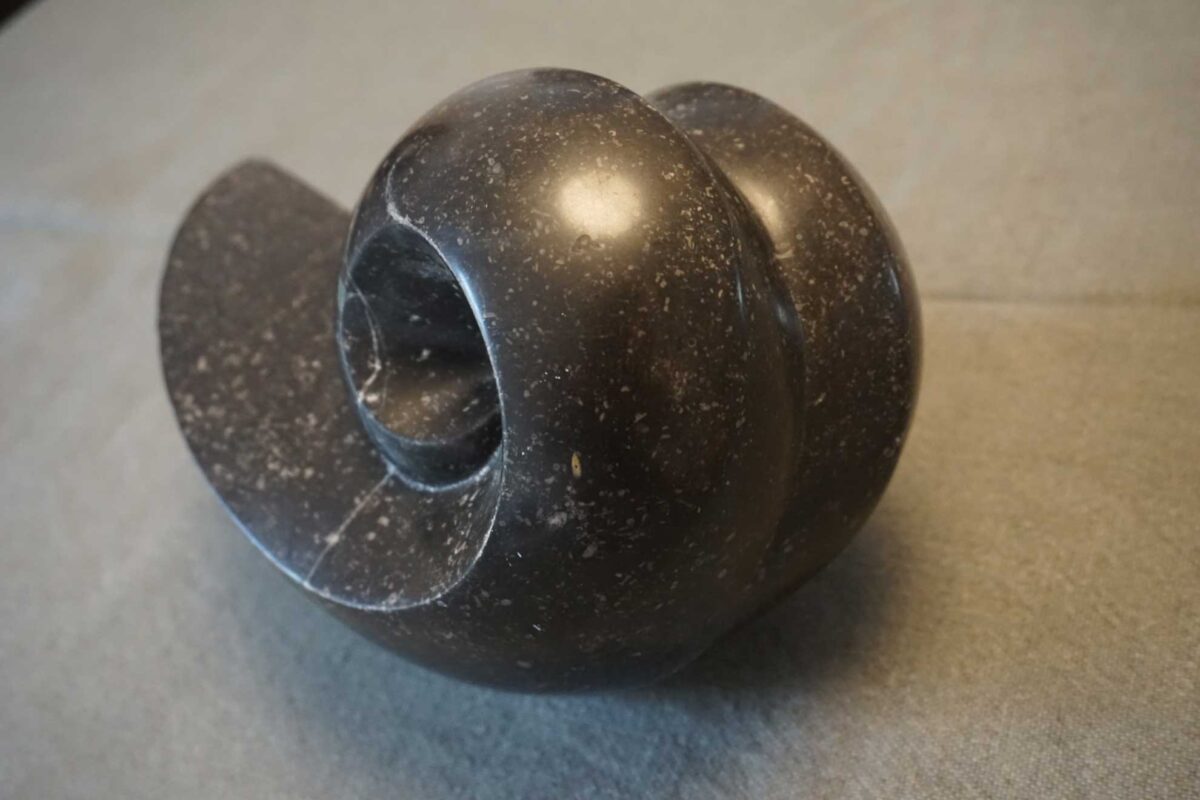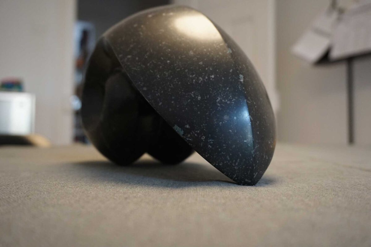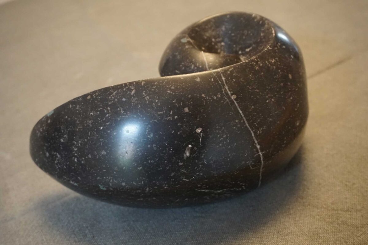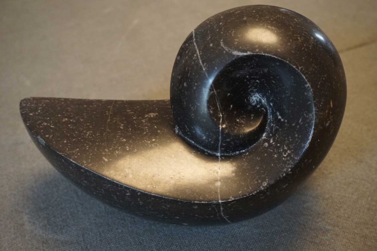 Damals, 1990, habe ich an einem Stück Stein herumgewerkelt, den ich heute noch gern betrachte und hin- und herdrehe. Auch ein wenig stolz drauf bin. Es ist ein Belgischer Muschelkalk, schwarz mit weissen Muschel-Einschlüssen, wie man ihn von den alten Post-Schalter kennt.