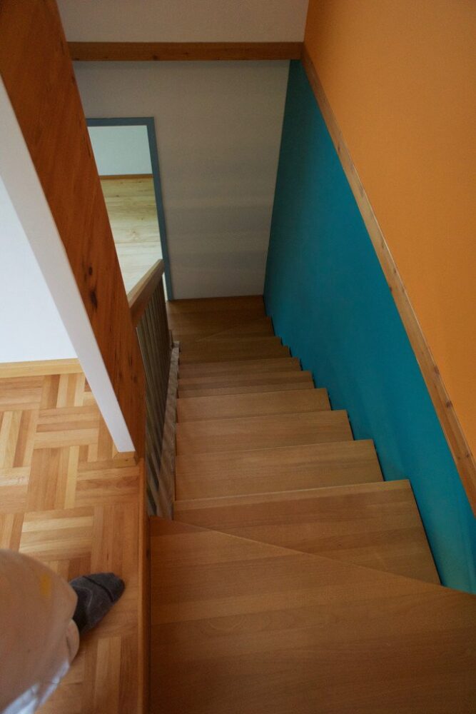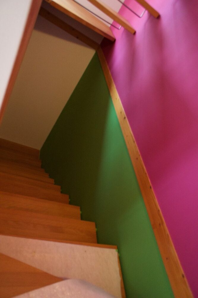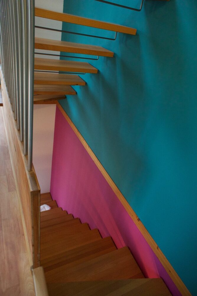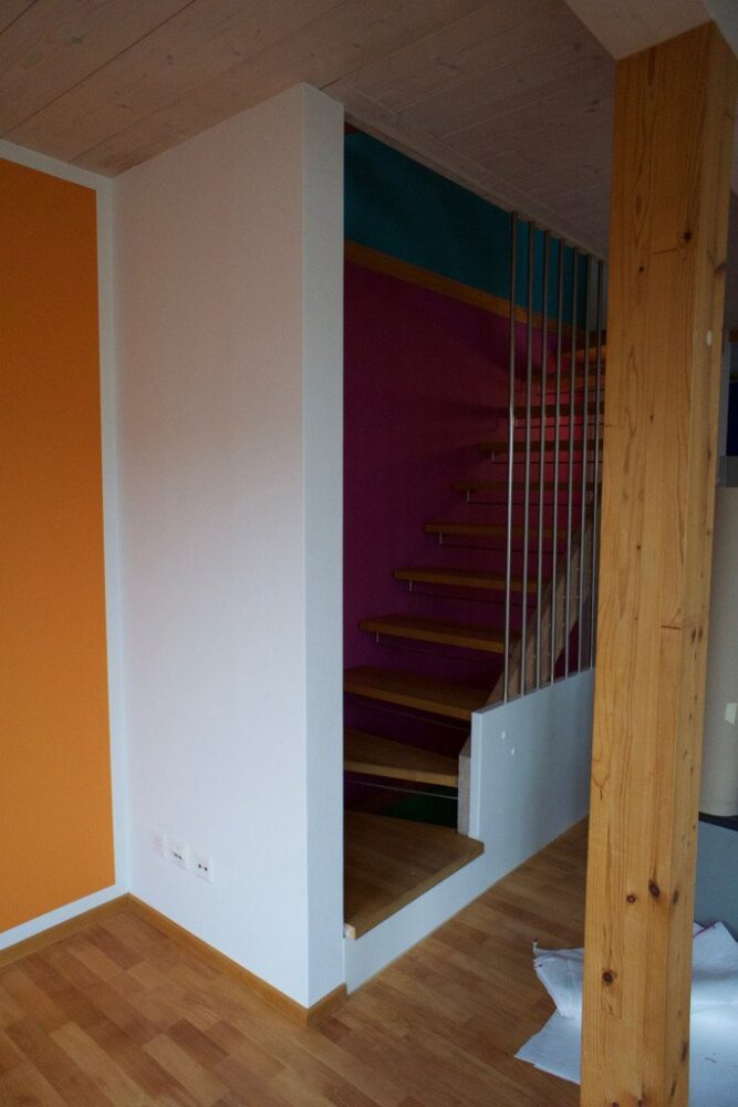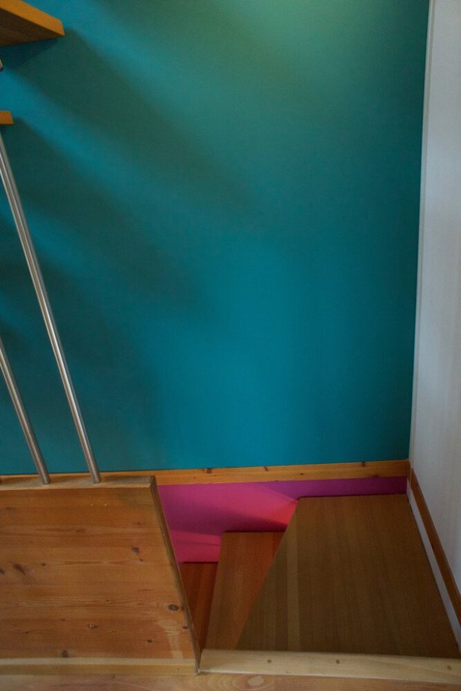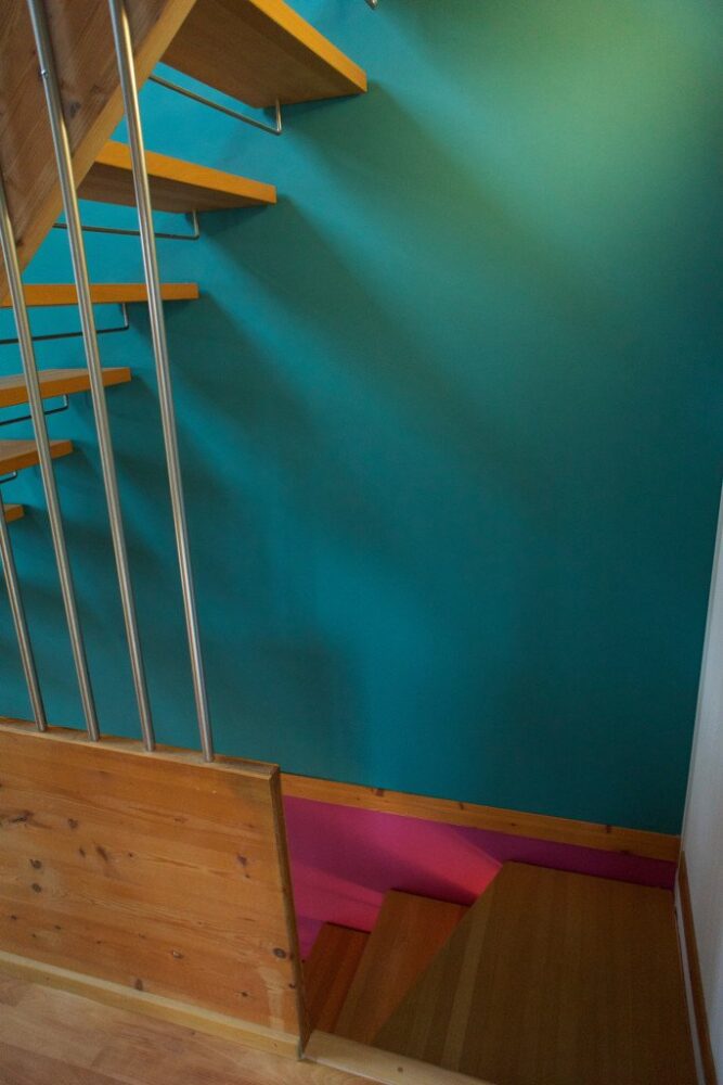Bemerkenswert ist, wie Frau z’Rotz auf die Architektur des Hauses eingeht und die Farbtupfer ausschliesslich an den der Treppe zugewandten Seiten gesetzt hat.