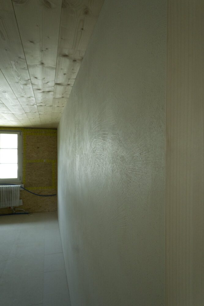 Da das Haus währschaft, aber nicht herrschaftlich ist, haben wir einen kleinen Trick angewendet: Ich habe den Marmorino mit einem natürlichen Zuschlagstoff angereichert, der eine Körnung bewirkt, und dadurch eine sichtbare Struktur eingearbeitet…