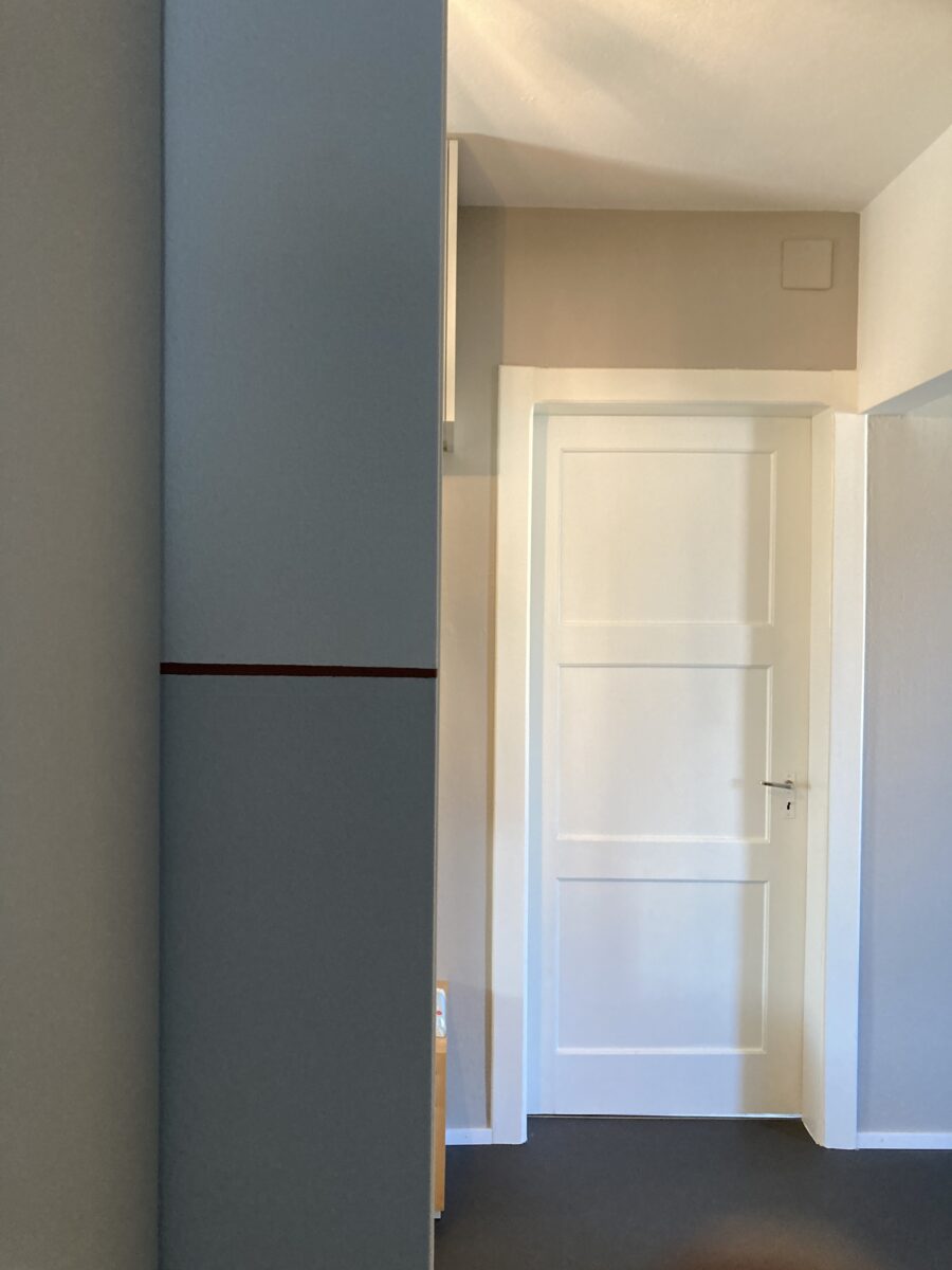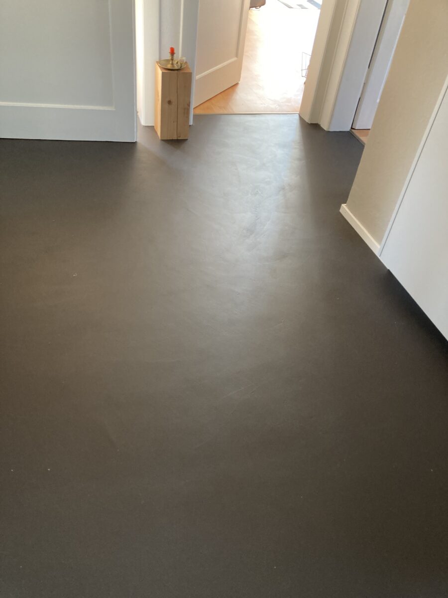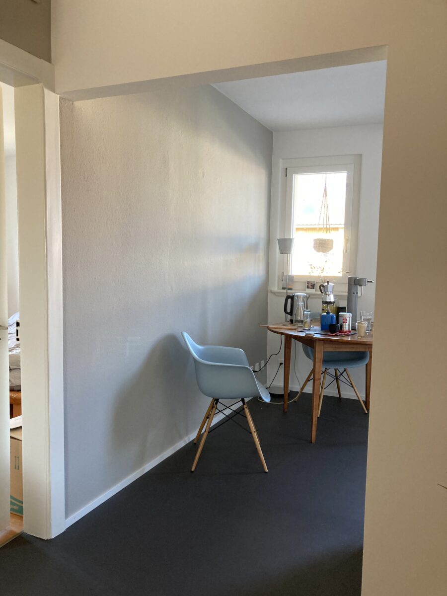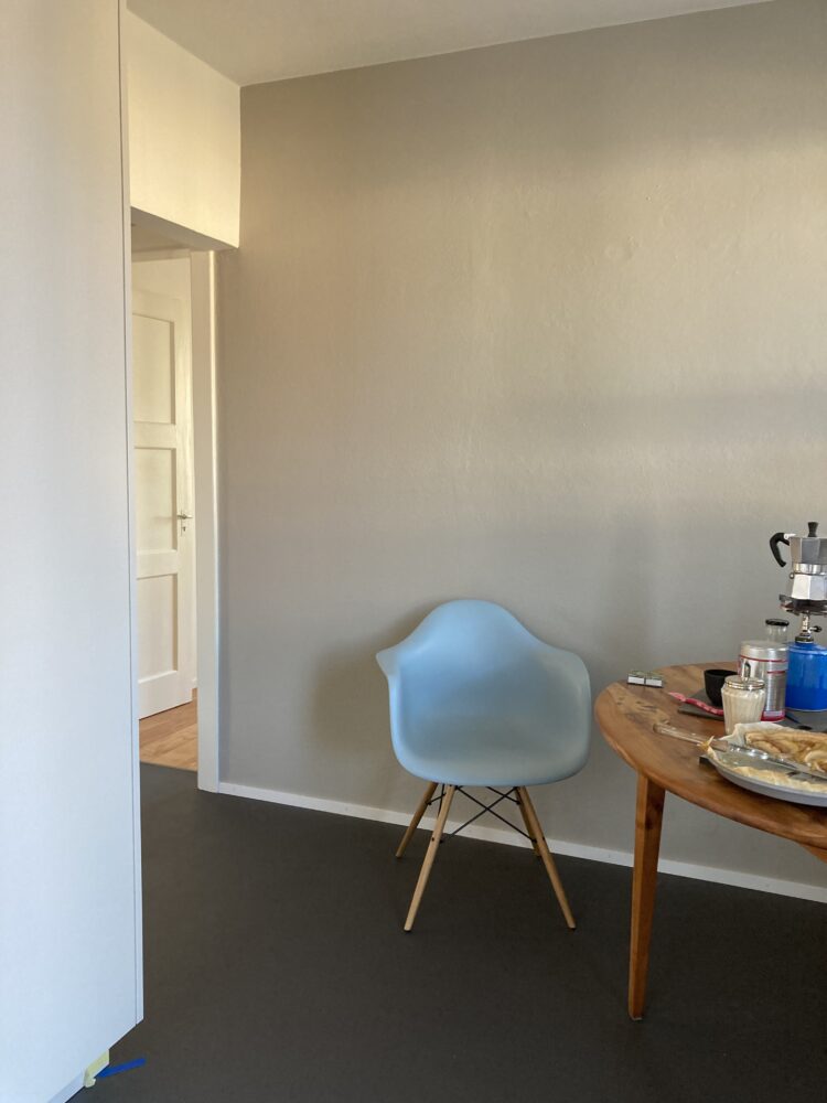 In einem schönen, kleinen Mehrfamilienhaus durfte ich die—gefliesten—Böden im Eingang, dem Bad und der Küche erneuern. Es wurde ein Naturofloor-Belag in dunklem Grau-Braun ausgesucht, während die Wände im grossen Ganzen in neutralem Weiss sind, mit einzelnen Kontrastwänden in zurückhaltenden Farben: