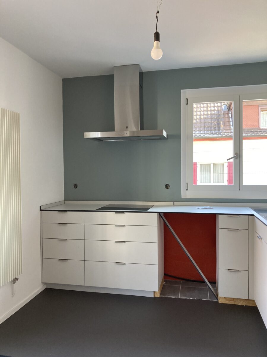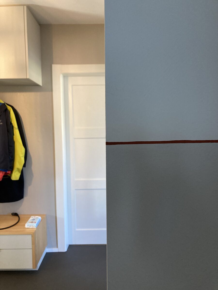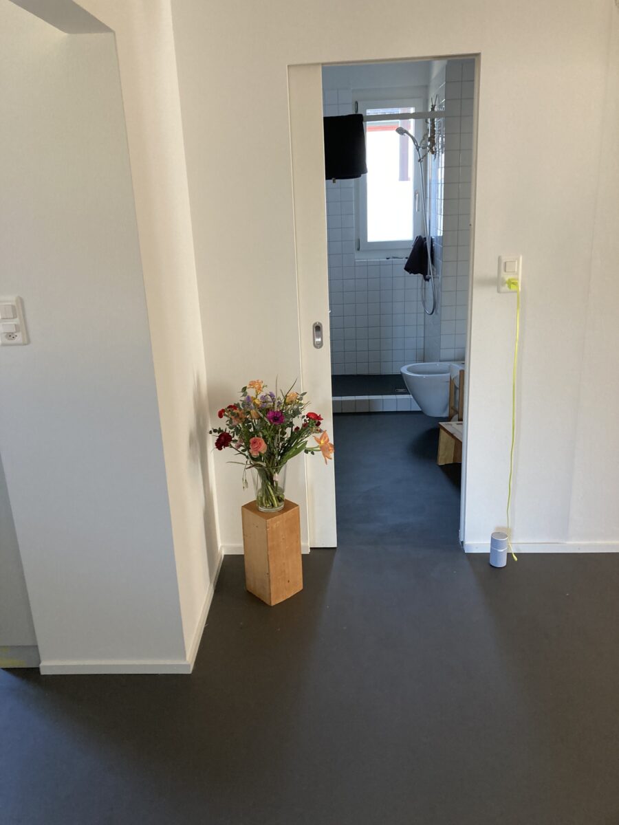 In einem schönen, kleinen Mehrfamilienhaus durfte ich die—gefliesten—Böden im Eingang, dem Bad und der Küche erneuern. Es wurde ein Naturofloor-Belag in dunklem Grau-Braun ausgesucht, während die Wände im grossen Ganzen in neutralem Weiss sind, mit einzelnen Kontrastwänden in zurückhaltenden Farben:
