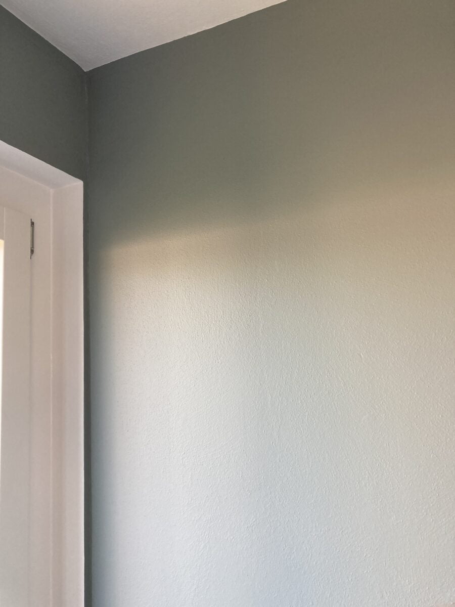 Im Eingang Dämmergrau, in der Küche Rosmaringrün, und im Bad den Klassiker Himmelgrau…