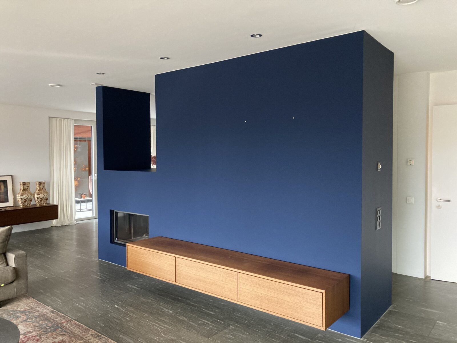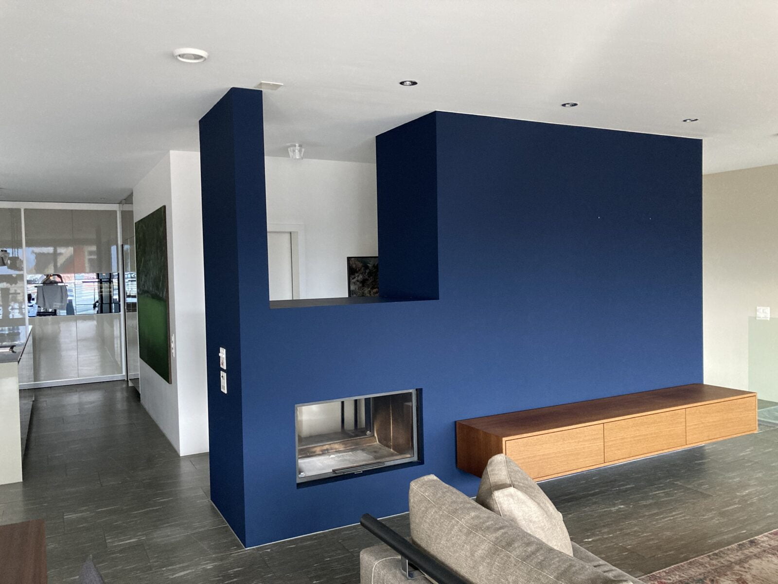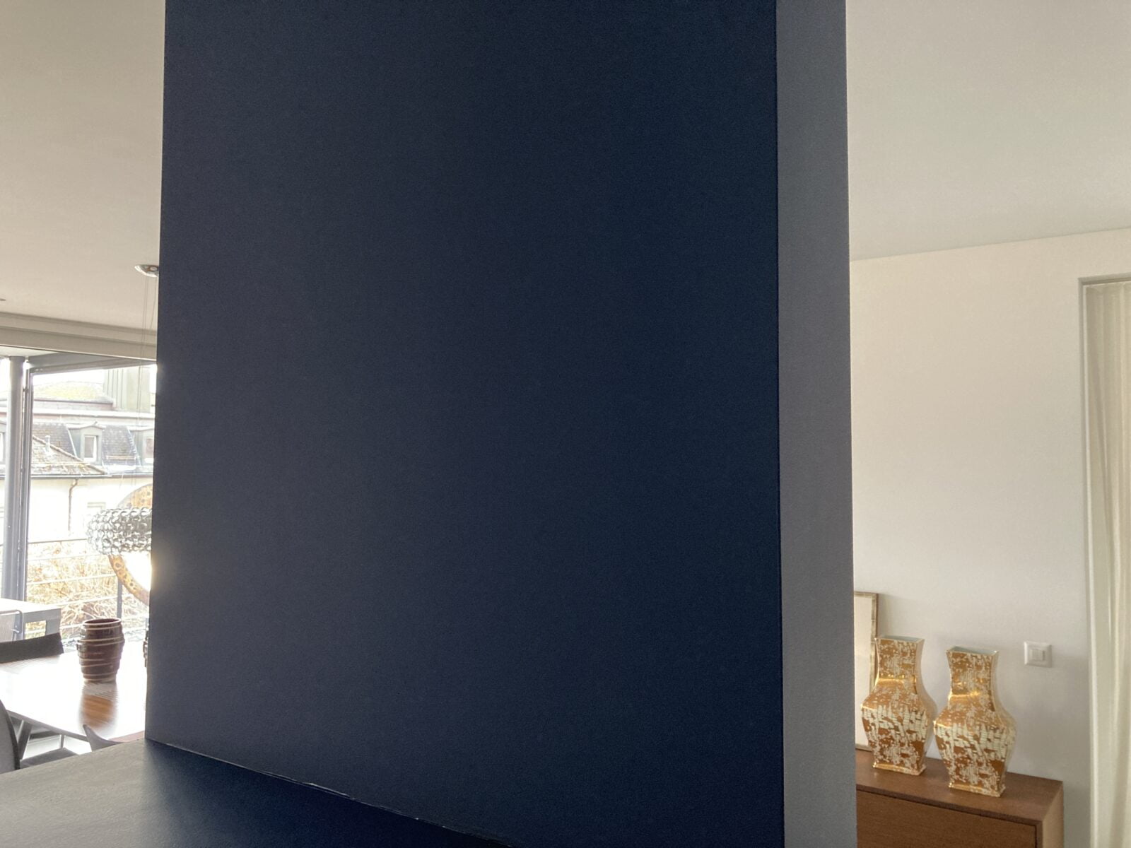 Es wurde der prominente Cheminée-Block (mit Garderobe auf der anderen Seite) mit dem tiefen Nachthimmelblau 12.048 Noir Turquoise umgestaltet. Dieses Blau ist magisch. Der Farbton ist aus der Farbreihe „Hella Jongerius“ hervorgegangen, er besticht durch seine Farbigkeit: Wie der Nachthimmel an einem schönen Sommerabend leuchtet es blau und geht in tiefes schwarz über. Und zwischendurch schaut man das Objekt an, gerät ein wenig ins Sinnieren und vergisst, dass es eigentlich eine dunkle Farbe ist…