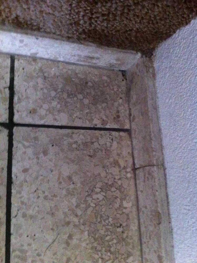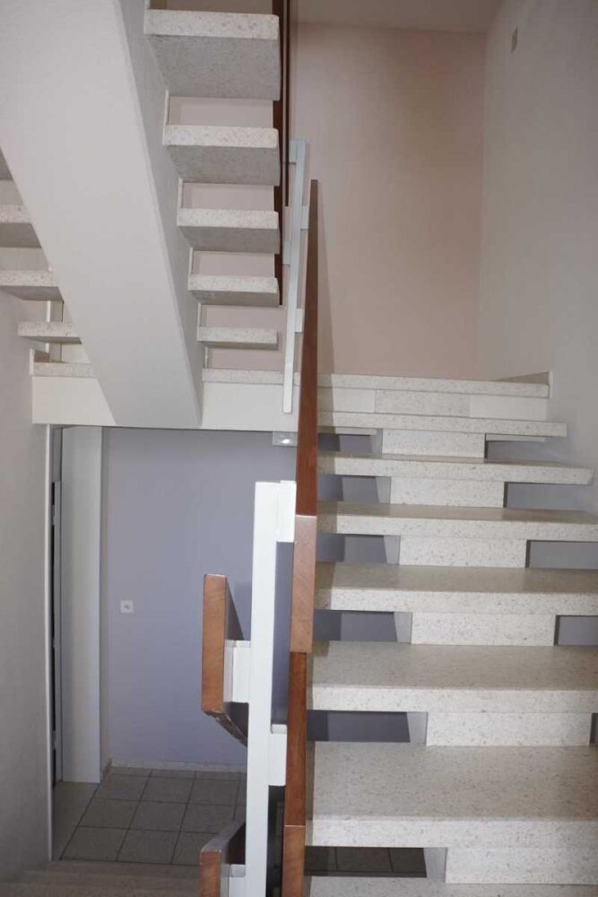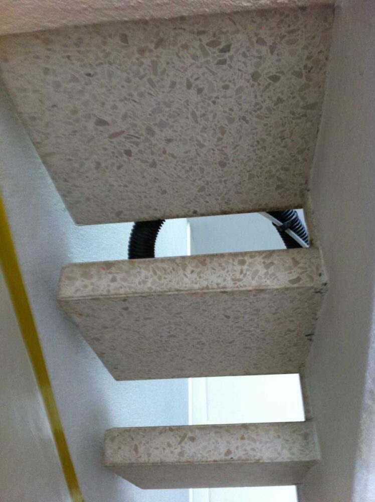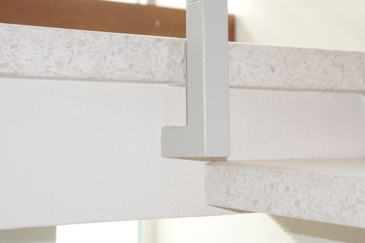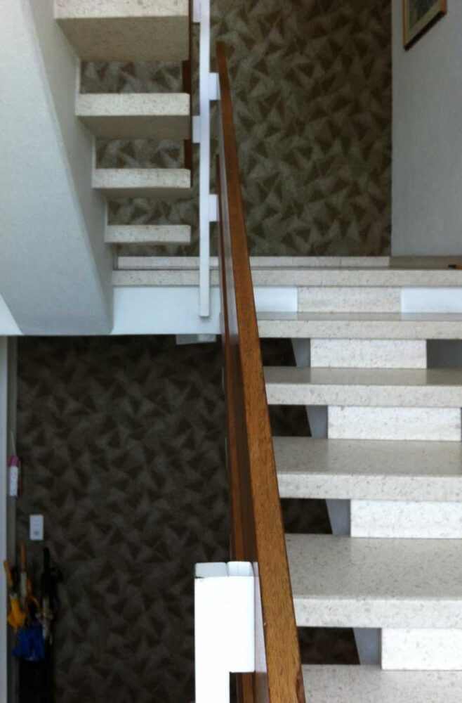 Die erste Herausforderung: Terrazzo-Böden, 40 Jahre alt, entsprechend gealtert. Die Stufen sind Terrazzo-Platten, Untersicht sichtbar und ebenso „patiniert“.