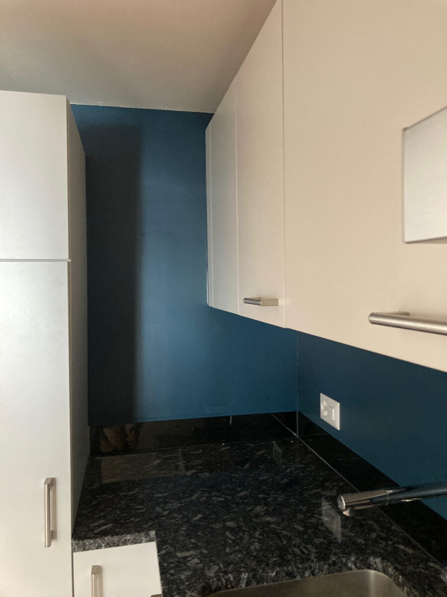 - einer dunkeltürkis Küchenrückwand (schliesst die Konturen ab und nimmt der grauen Küche das staubige ab)