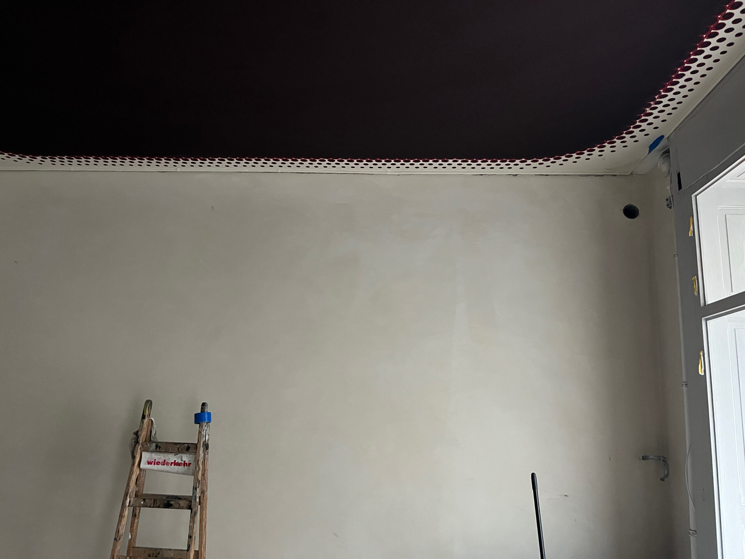 Erst darauf würde dann die nächste Schicht Leimfarbe gestrichen. Das hat den Vorteil, dass sich Farbschichten nicht aufaddieren, und die Leimfarbe nie so dick wird, dass sie kaum mehr entfernt werden kann. Weil ja jeweils nur ein Anstrich an der Decke ist. So eine Decke geht nicht mehr von der Malerei kaputt…