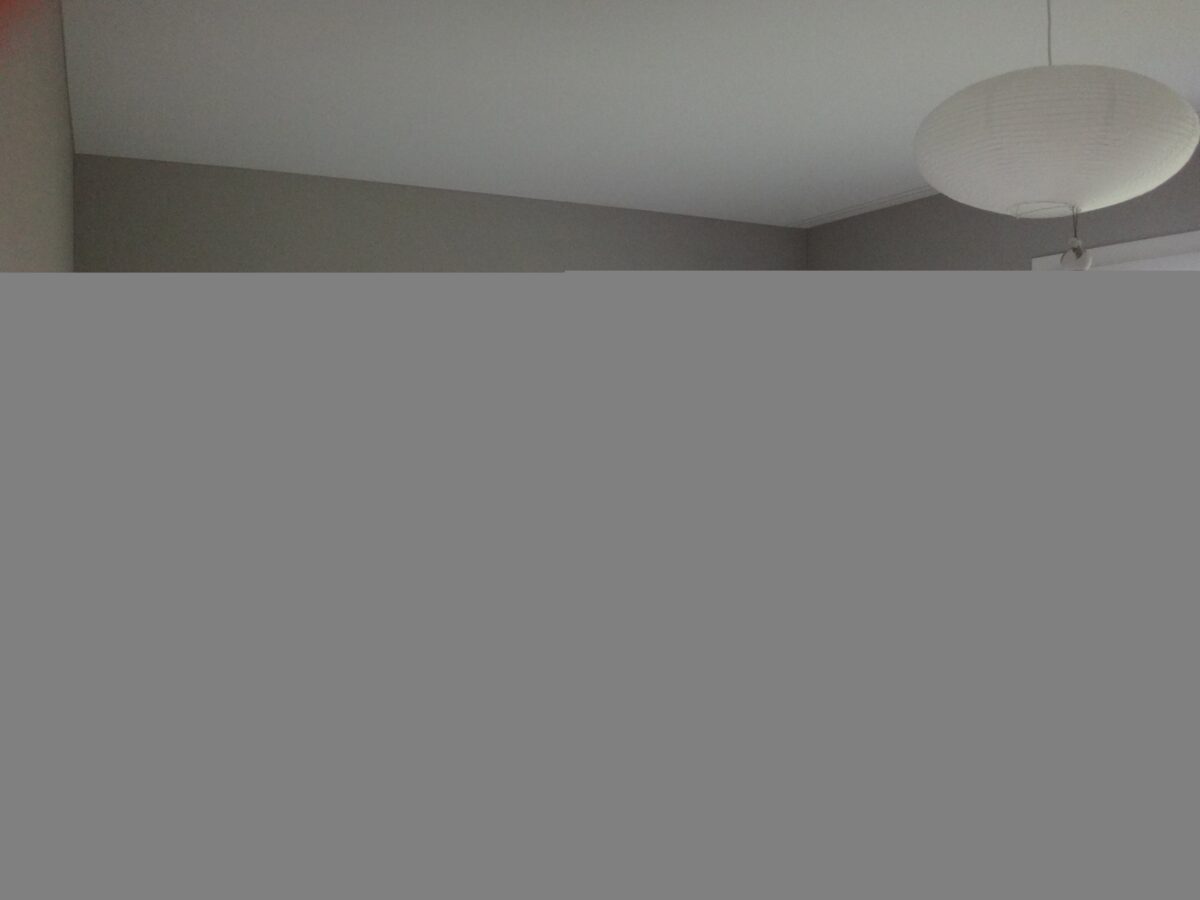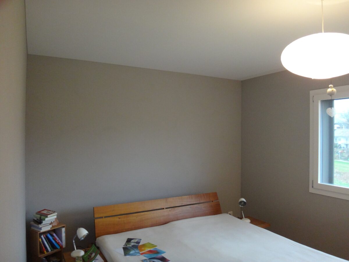 Mit dem wunderbar in sich ruhenden Dämmergrau von kt.color wird das Schlafzimmer in seiner Räumlichkeit erfassbar. Das ausgesuchte Mobiliar wird genauso wie die Bewohner warm und klar konturiert. Sie treten in den Mittelpunkt des Geschehens (beachten Sie das erste Bild, wie die Wand dahinter den Holzleisten der Lampe den Rahmen zeichnet).
